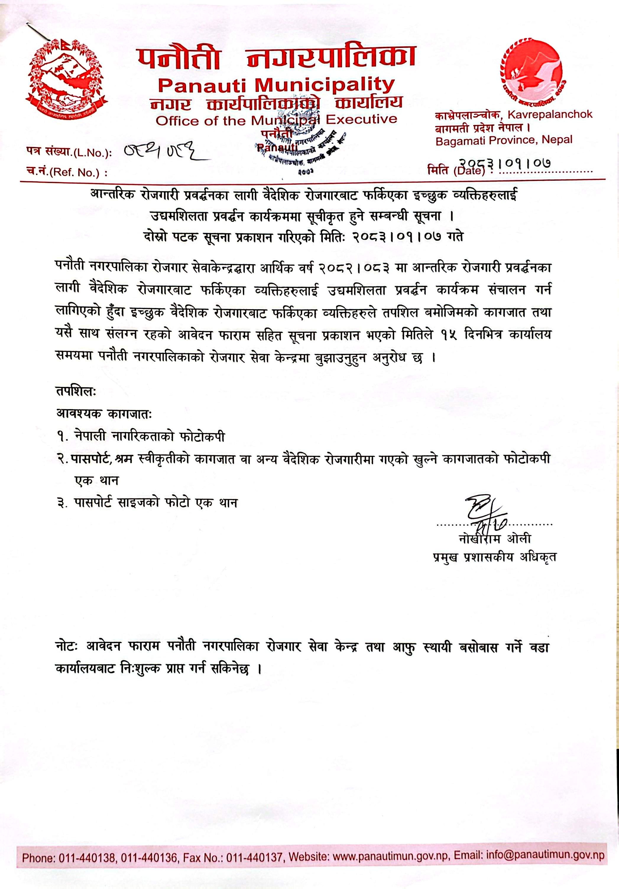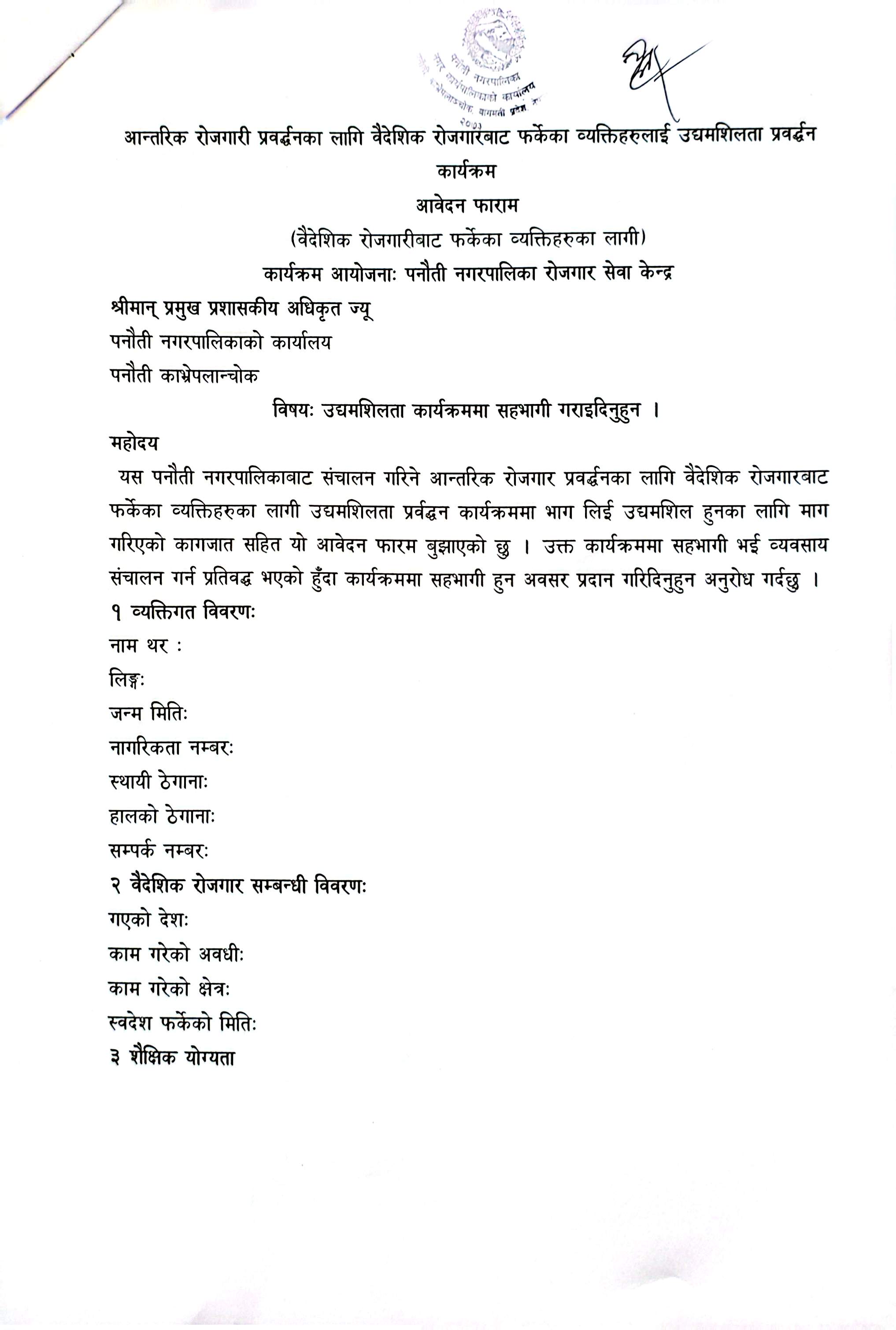 » आन्तरिक रोजगारी प्रवर्द्धनका लागी वैदेशिक रोजगारबाट फर्किएका इच्छुक व्यक्तिहरुलाई उद्यमशीलता प्रवर्द्धन कार्यकममा सूचीकृत हुने सम्बन्धी सूचना