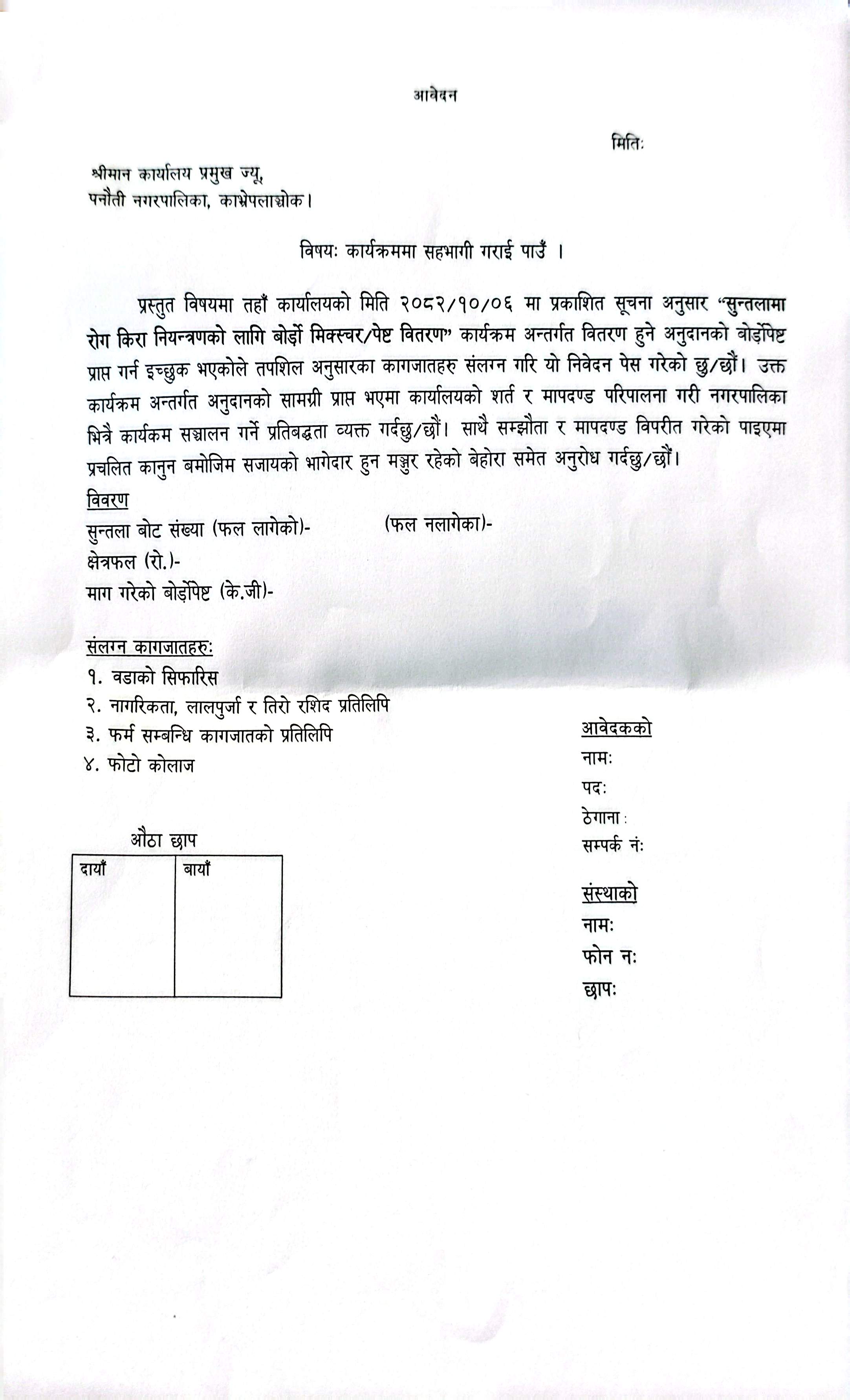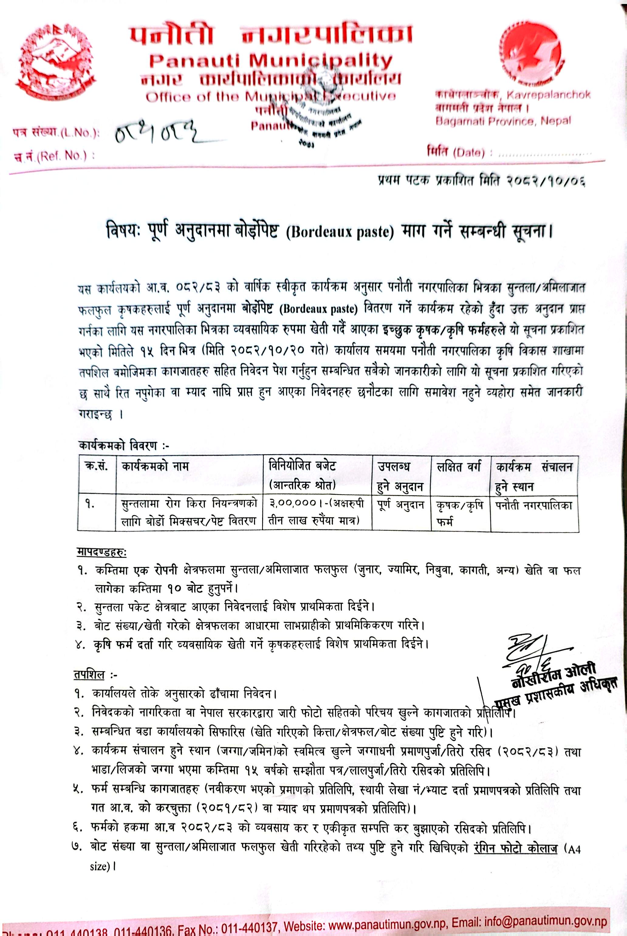पूर्ण अनुदानमा बोर्डोपेष्ट (Bordeaux paste) माग गर्ने सम्बन्धी सूचना।