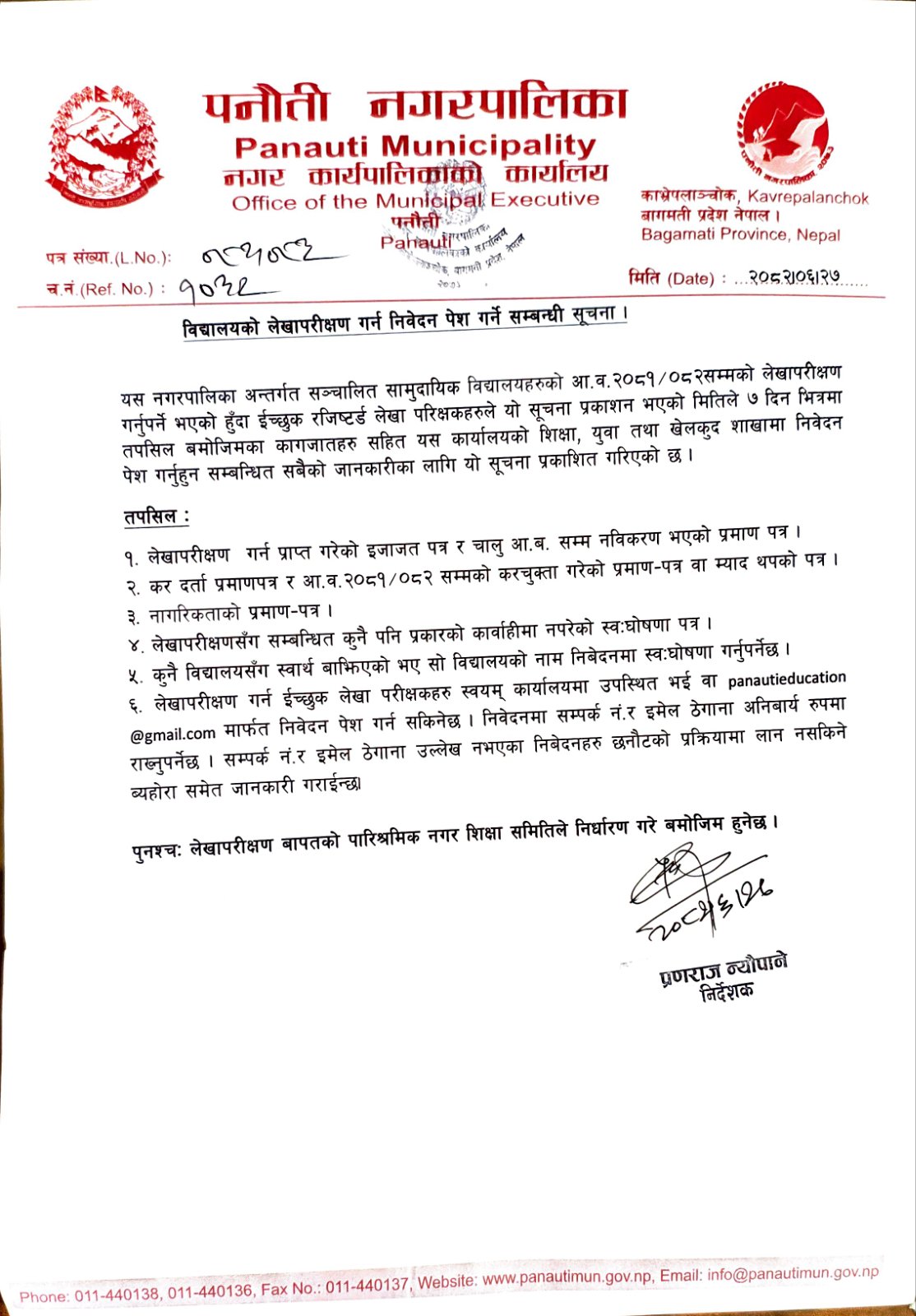 बिद्यालयको लेखापरिक्षण गर्न निवेदन पेश गर्ने सम्बन्धी सूचना ।