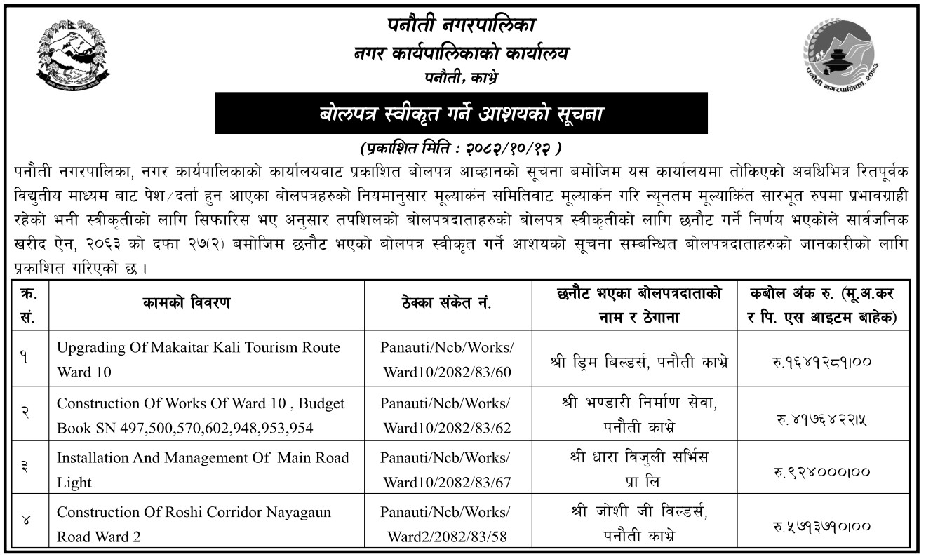 मिति २०८२/१०/१२ गते नेपाल समाचारपत्रमा प्रकाशित बोलपत्र स्वीकृत गर्ने आशयको सूचना