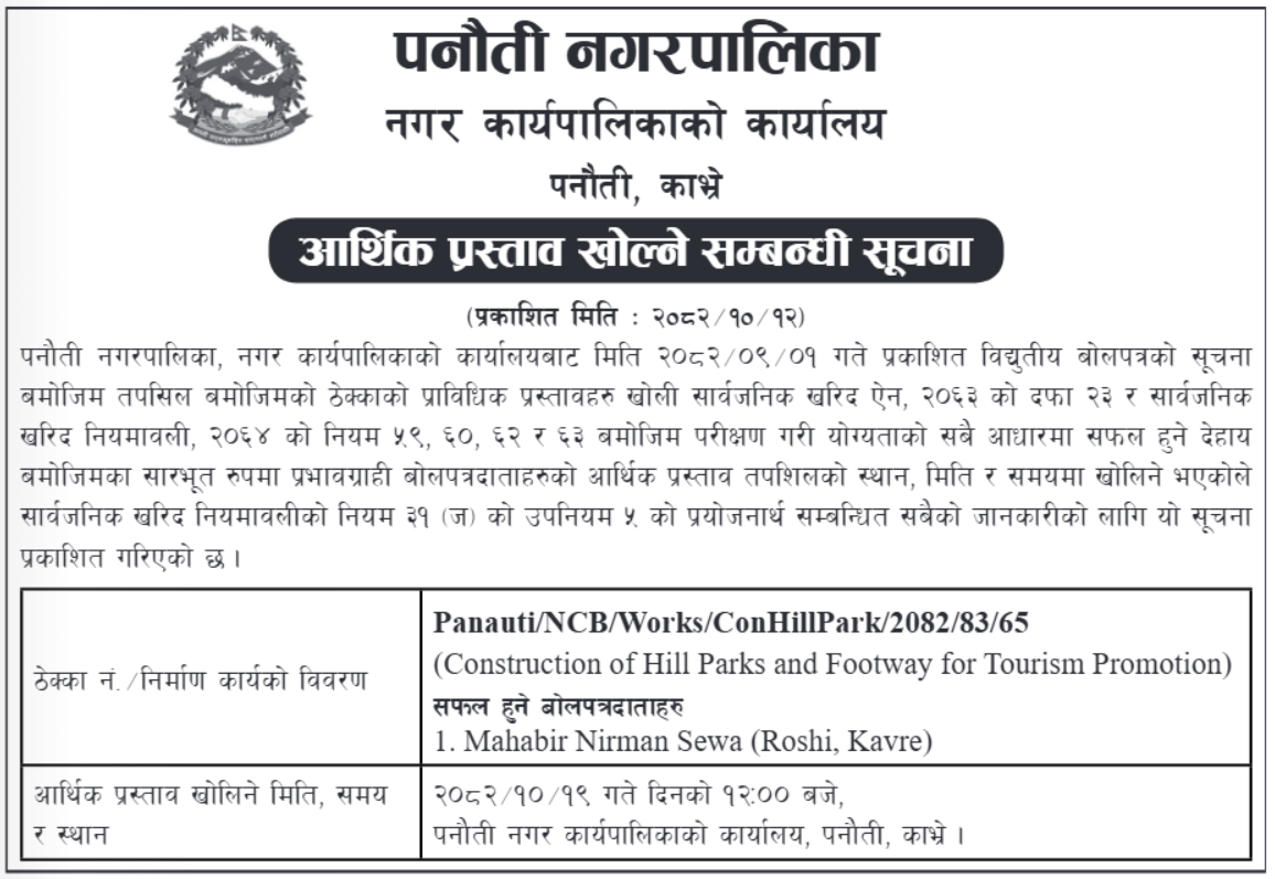 मिति २०८२/१०/१२ गते राजधानी पत्रिकामा प्रकाशित आर्थिक प्रस्ताव खोल्ने सम्बन्धी सूचना