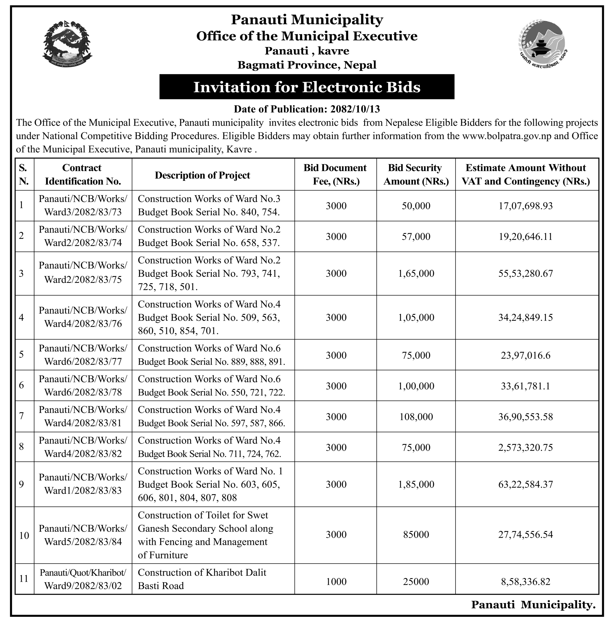 मिति २०८२/१०/१३ गते नेपाल समाचारपत्रमा प्रकाशित बोलपत्र आह्वान सम्बन्धी सूचना