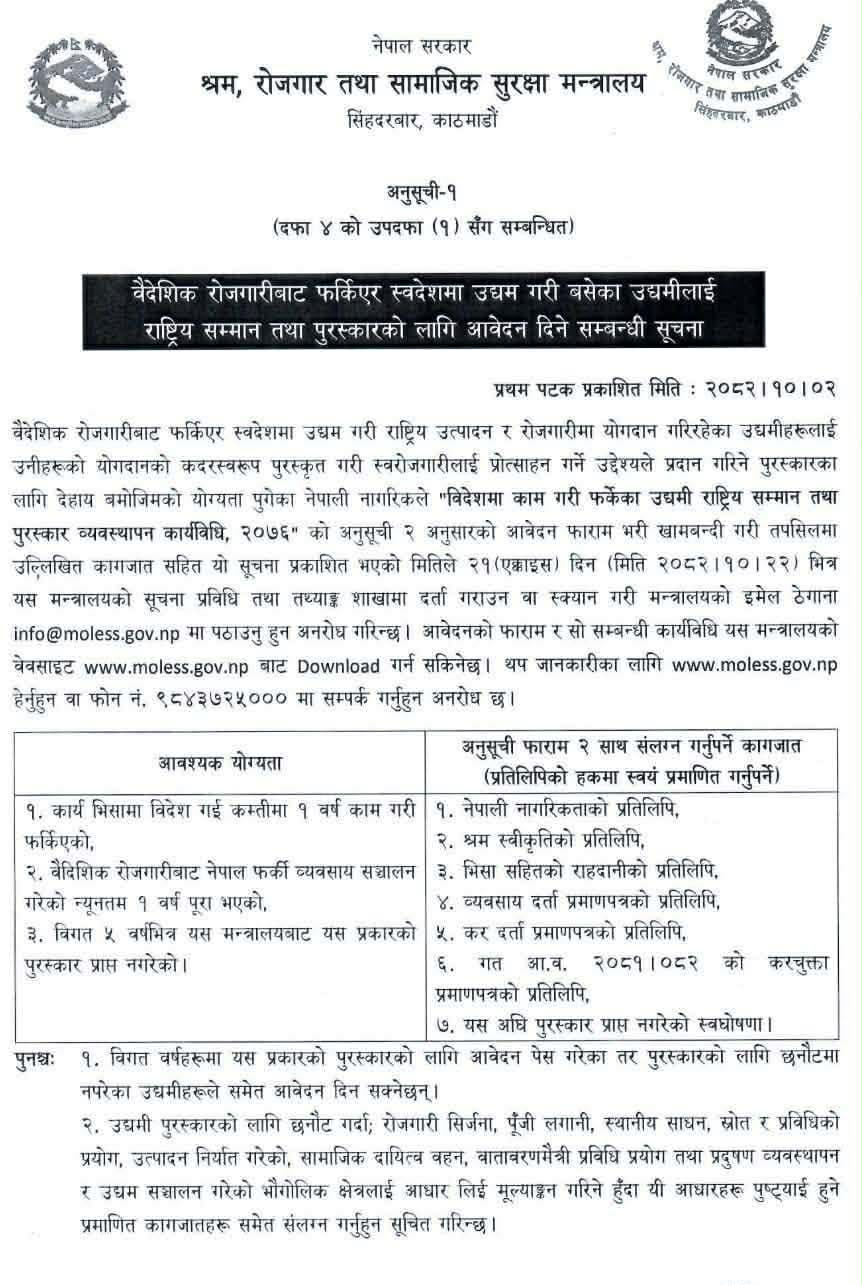 वैदेशिक रोजगारीबाट फर्किएर स्वदेशमा उद्यम गरी बसेका उद्यमीलाई राष्ट्रिय सम्मान तथा पुरस्कारको लागि आवेदन दिने सम्बन्धी सूचना