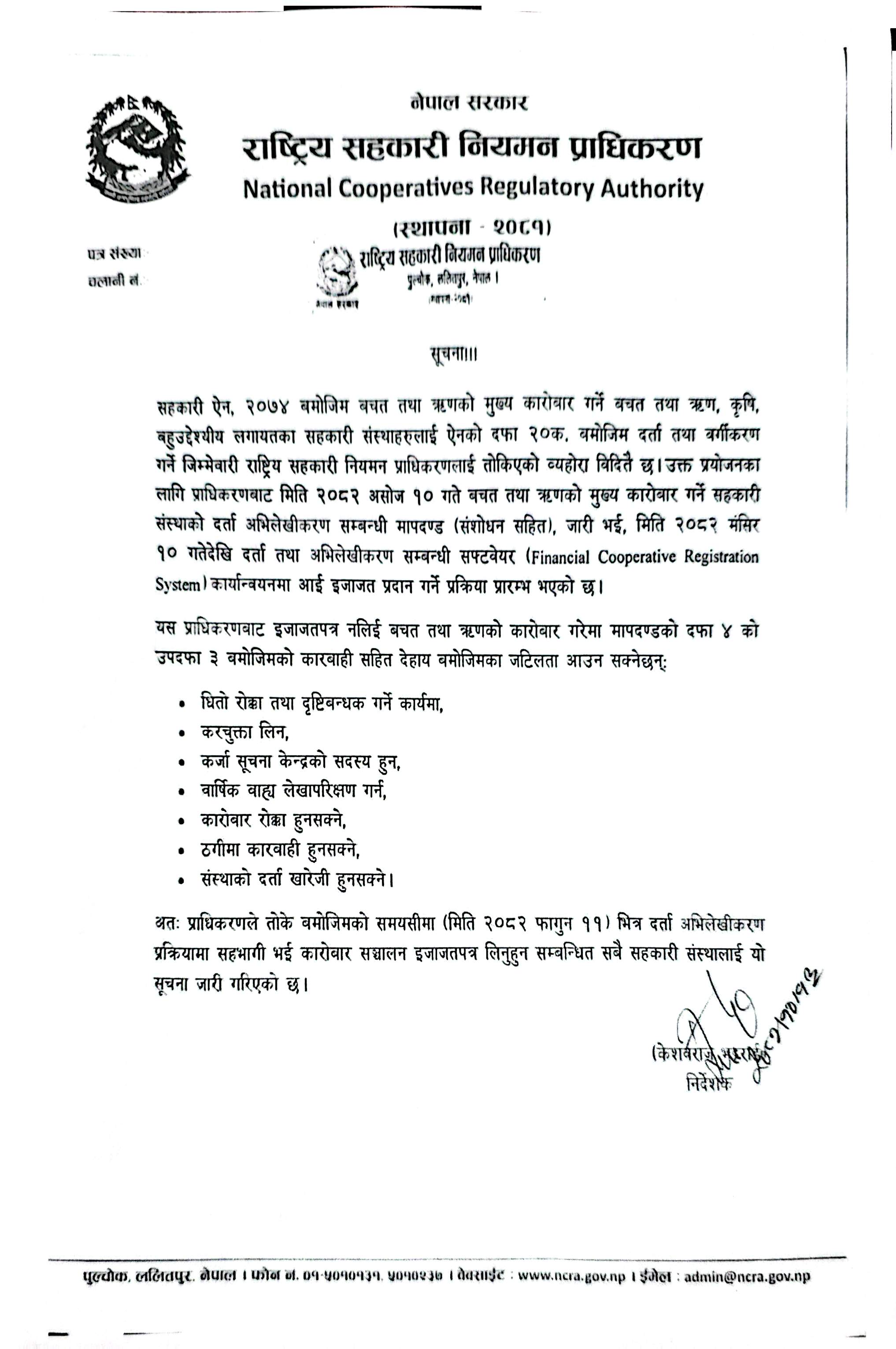 सहकारी संस्थाको दर्ता अभिलेखीकरण मापदण्ड, २०८२ बमोजिम विवरण प्रविष्टि गर्नें सम्बन्धि अत्यन्त जरुरि सूचना I