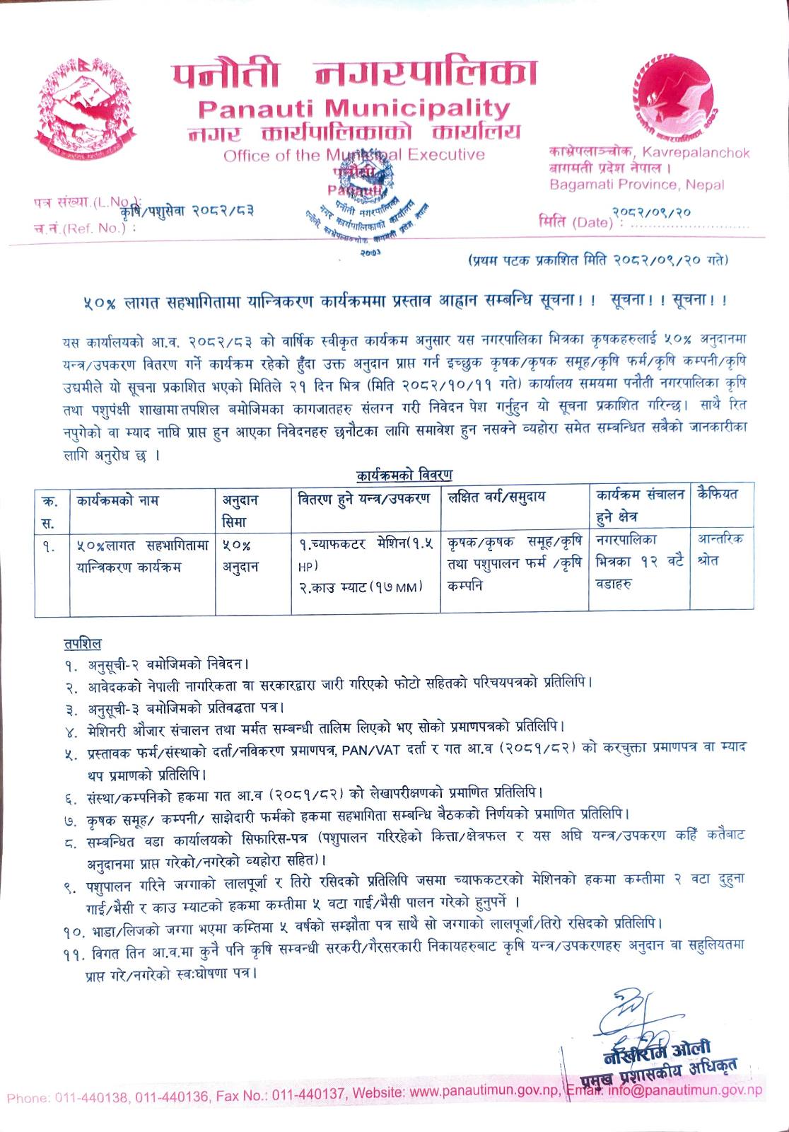 ५०% लागत सहभागीतामा यान्त्रिकरण कार्यक्रममा प्रस्ताव आव्हान सम्बन्धी सूचना ।