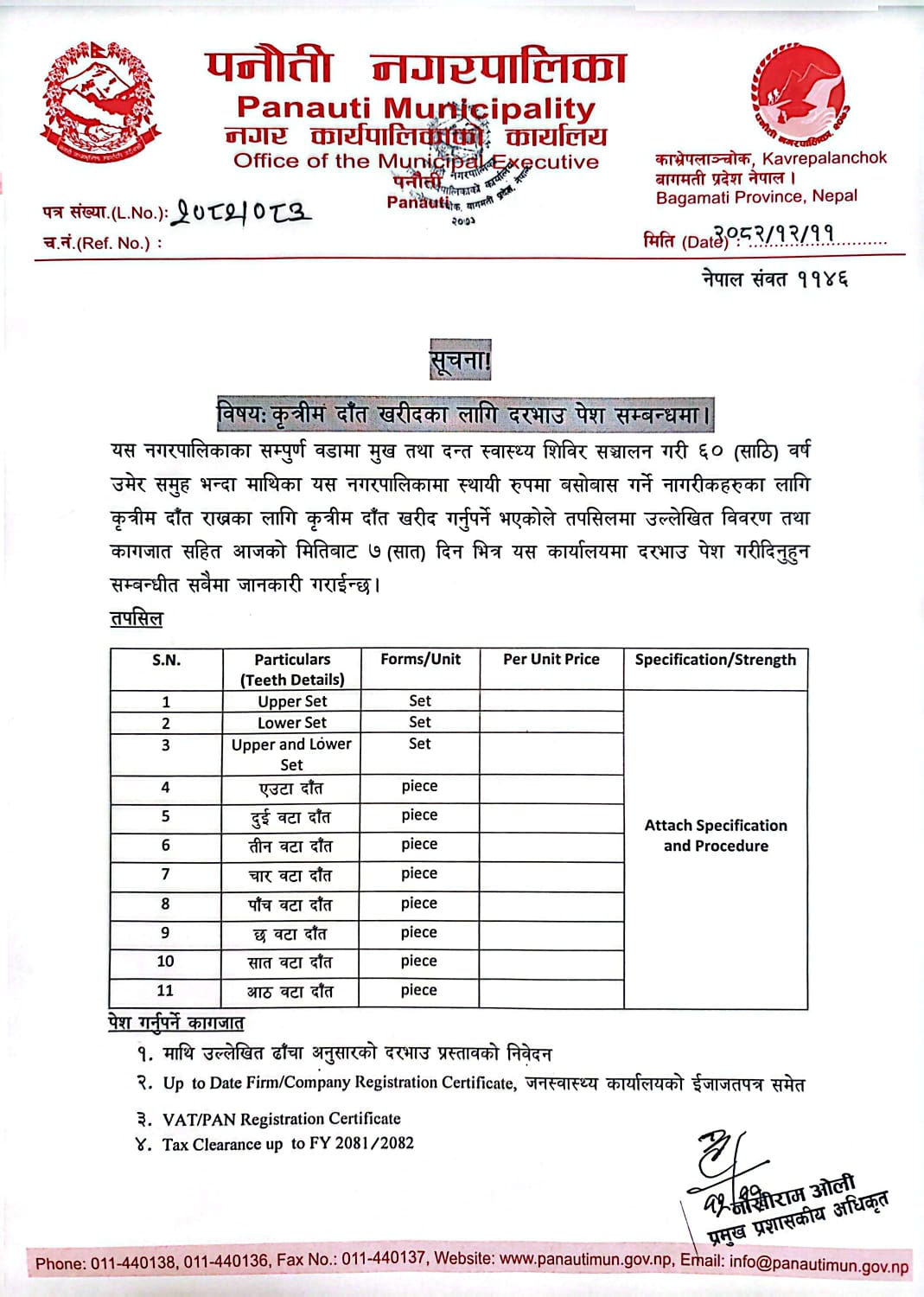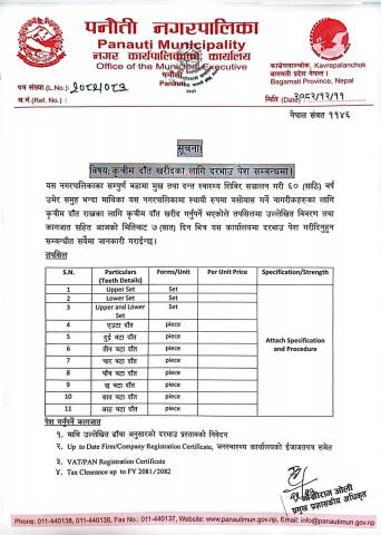 कृत्रिम दाँत खरीदका लागि दरभाउ पेश सम्बन्धी सूचना