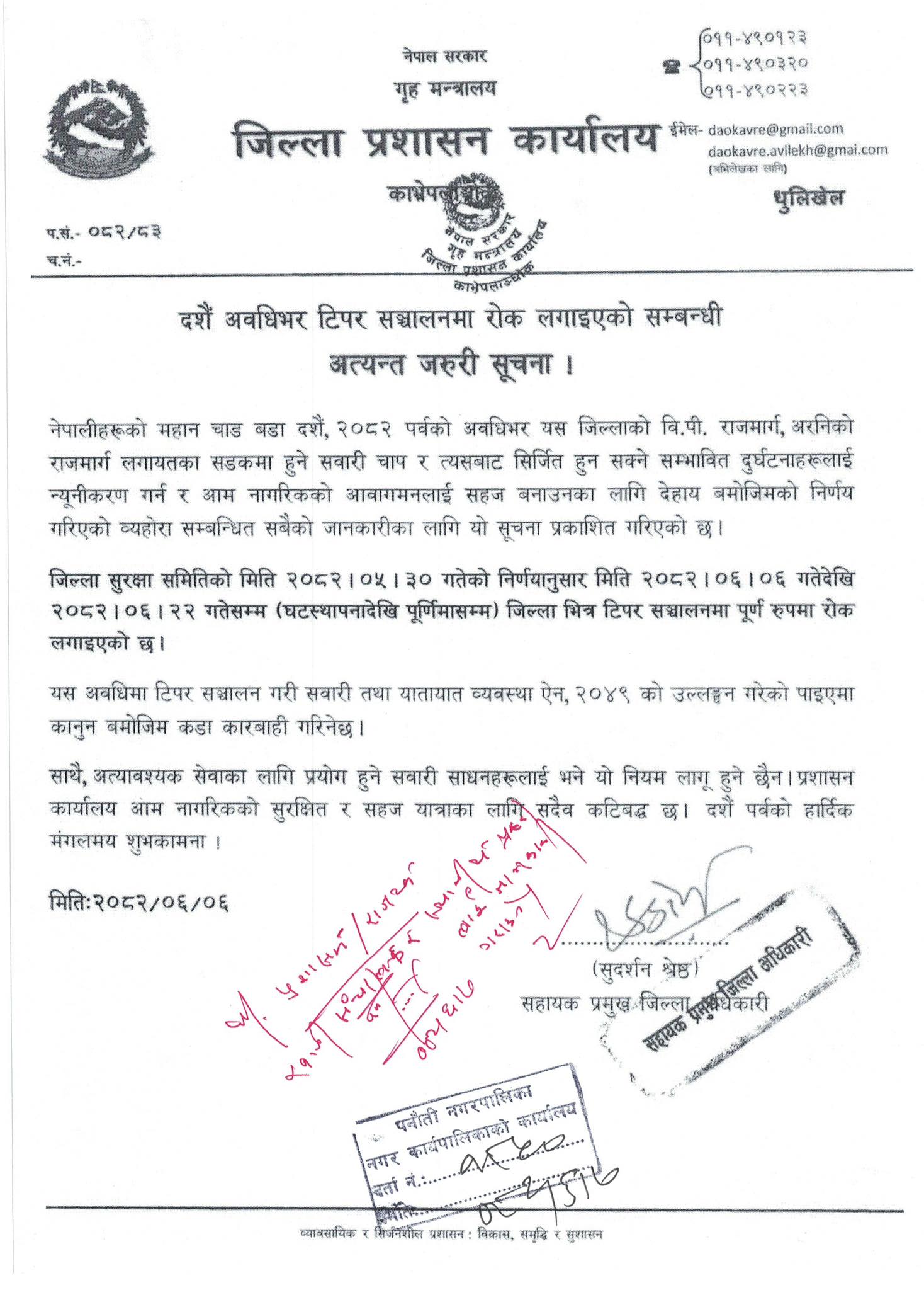 » दशैं अवधिभर टिपर संचालनमा रोक लगाइएको सम्बन्धी जिल्ला प्रशासन कार्यालयको अत्यन्त जरुरी सूचना ।