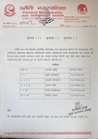 » पनौती नगर क्षेत्र भित्रका गाईभैंसी, भेडाबाख्रा तथा बंगुरहरुमा खोरेत रोग रोगथामको लागि निःशुल्क खोप लगाईने कार्यक्रम रहेको सूचना