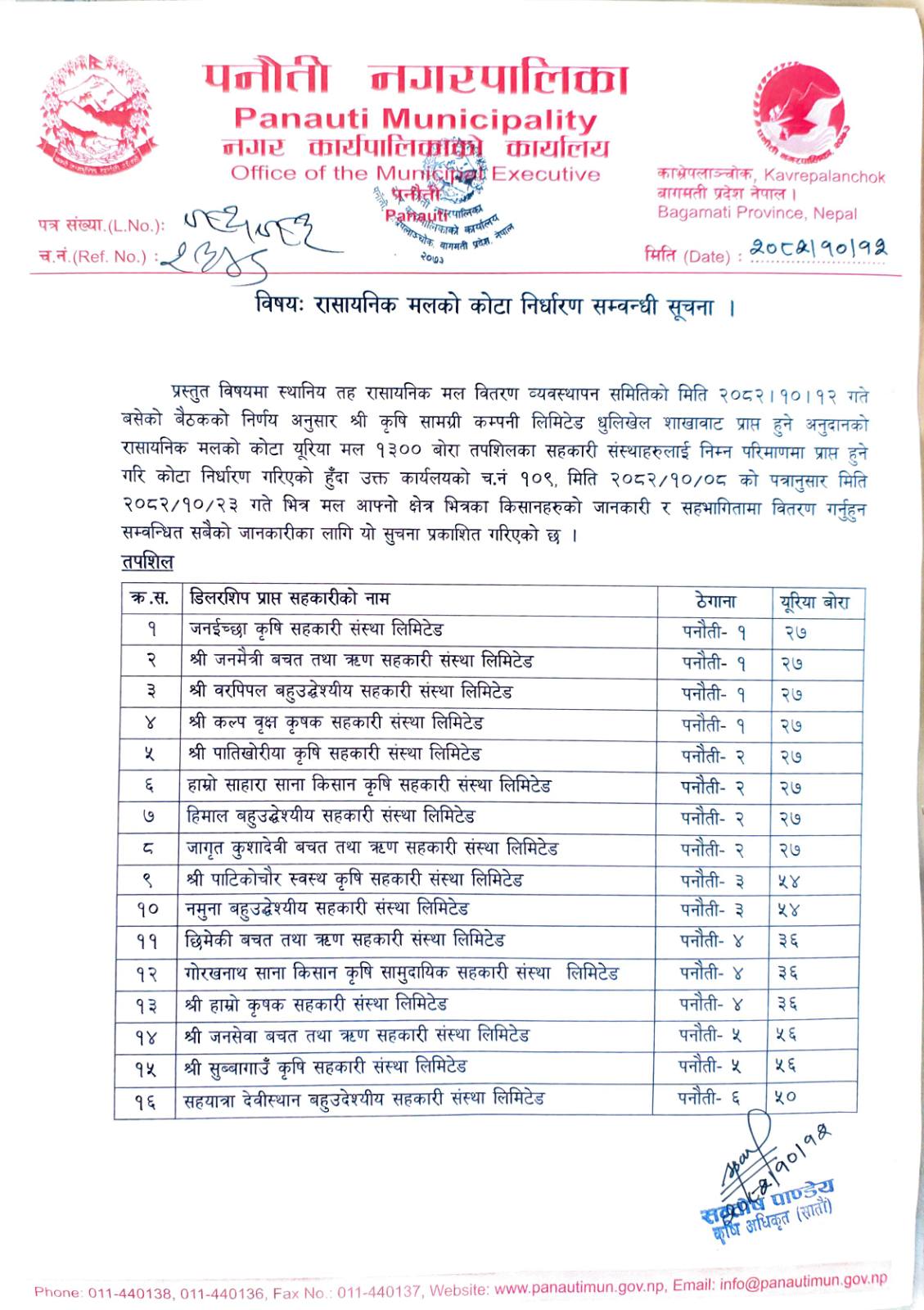 रासायनिक मलको कोटा निर्धारण सम्बन्धी सूचना ।
