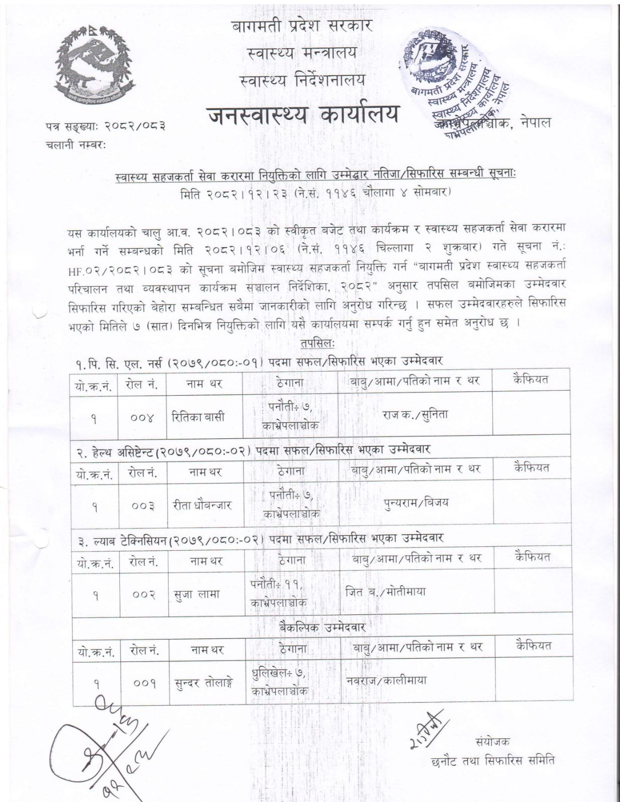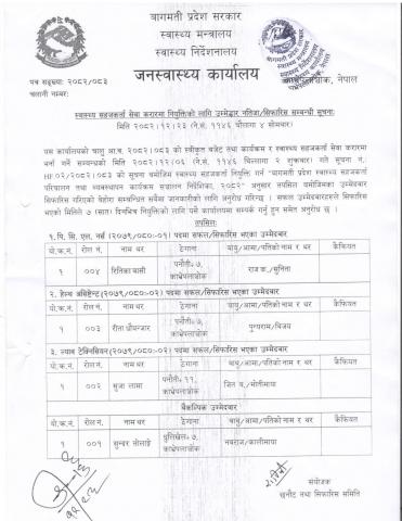 जनस्वास्थ्य कार्यालयको स्वास्थ्य सहजकर्ता सेवा करारमा नियुक्तिको लागि उम्मेद्धार नतिजा/सिफारिस सम्बन्धी सूचना