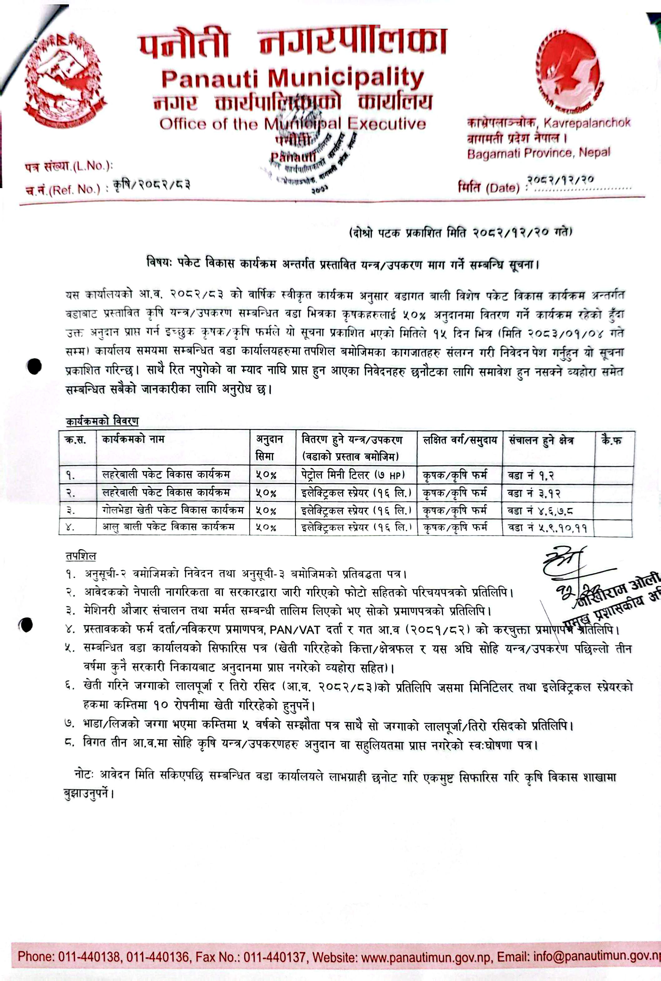 पकेट विकास कार्यक्रम अन्तर्गत प्रस्तावित यन्त्र / उपकरण माग गर्ने सम्बन्धि सूचना।