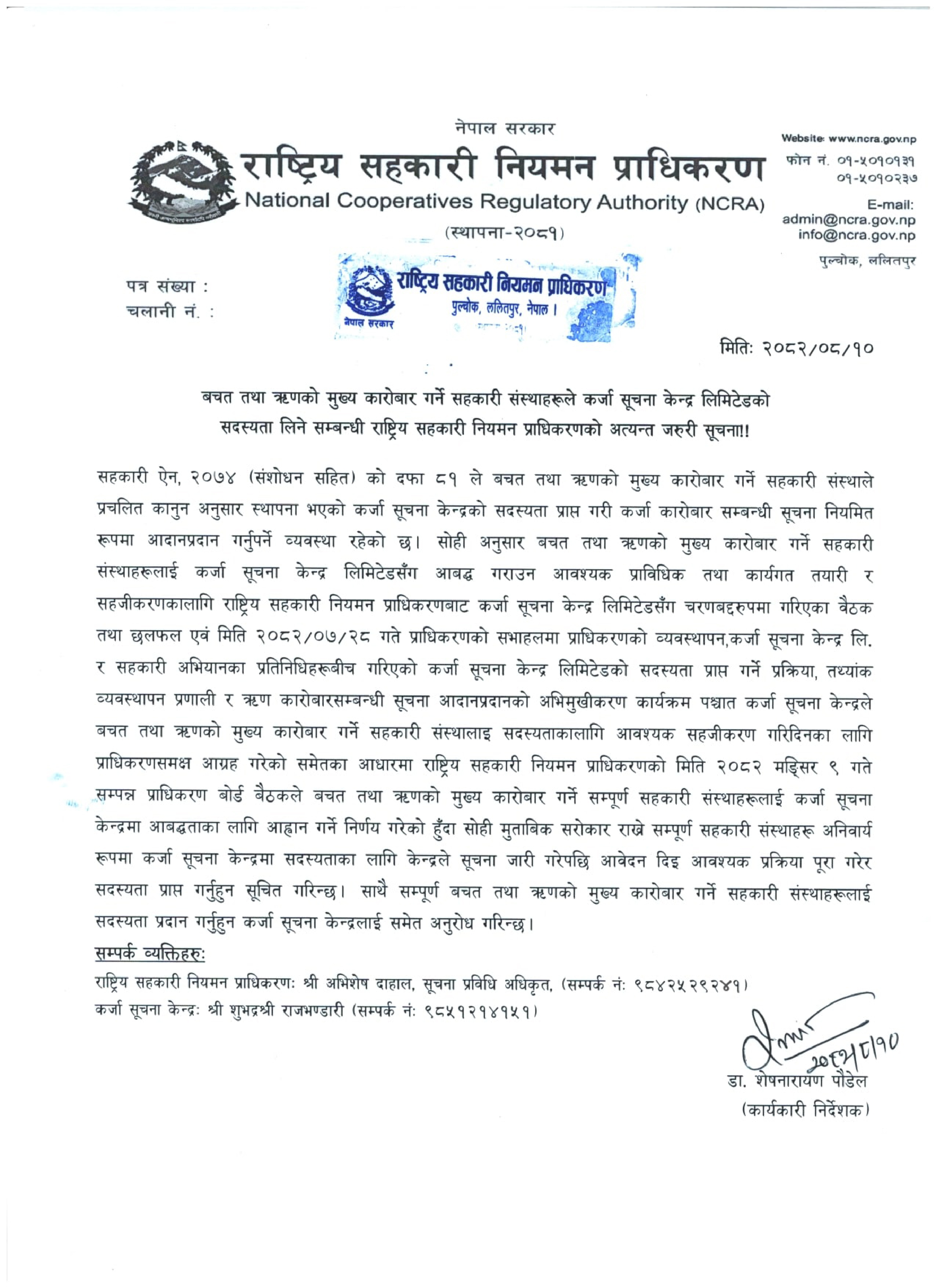 Home » बचत तथा ऋणको मुख्य कारोबार गर्ने सहकारी संस्थाहरूले कर्जा सूचना केन्द्र लिमिटेडको सदस्यता लिने सम्बन्धी राष्ट्रिय सहकारी नियमन प्राधिकरणको अत्यन्त जरुरी सूचना ।