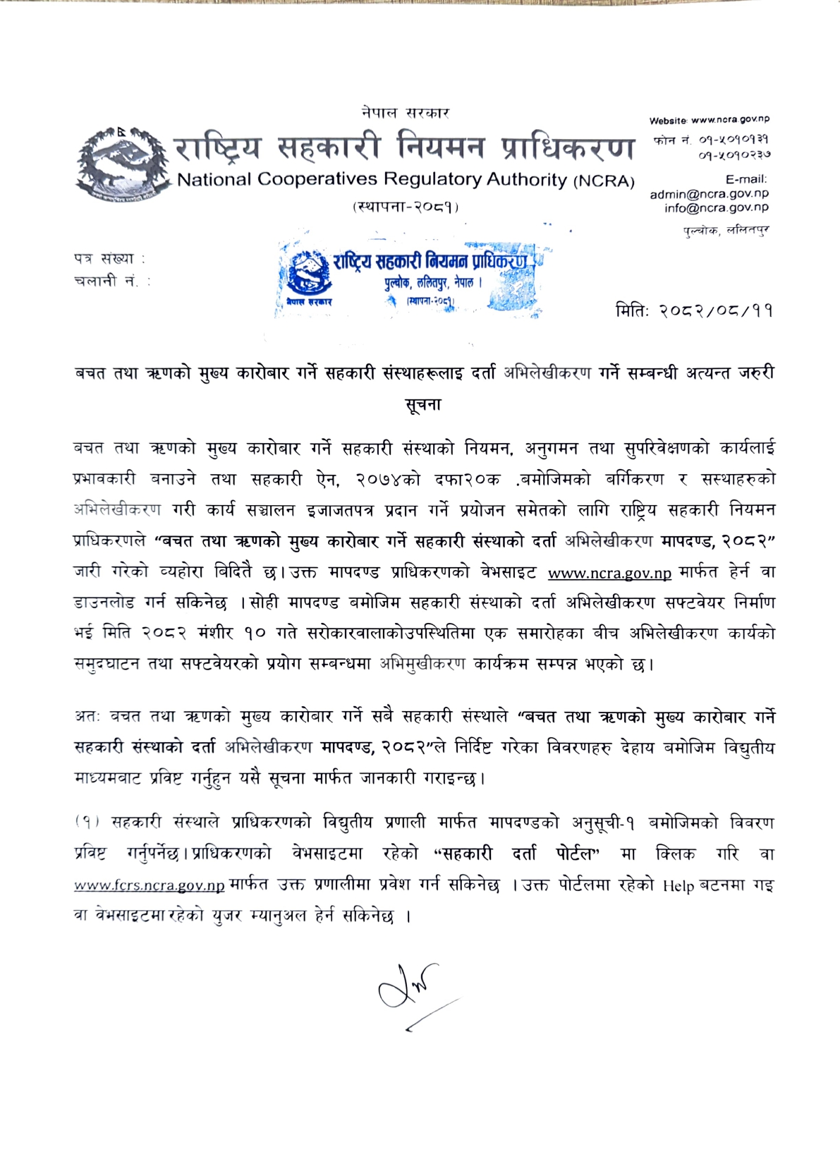 सहकारी संस्थाको दर्ता अभिलेखीकरण मापदण्ड, २०८२ बमोजिम विवरण प्रविष्टि गर्नें सम्बन्धि अत्यन्त जरुरि सूचना I