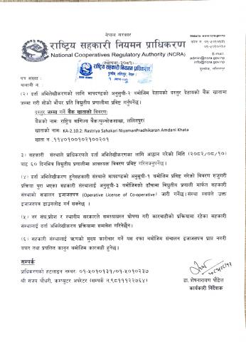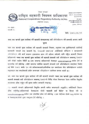 राष्ट्रिय सहकारी नियमन प्राधिकरणको बचत तथा ऋणको मुख्य कारोबार गर्ने सहकारी संस्थाहरुलाई दर्ता अभिलेखिकरण गर्ने सम्बन्धी अत्यन्त जरुरी सूचना ।