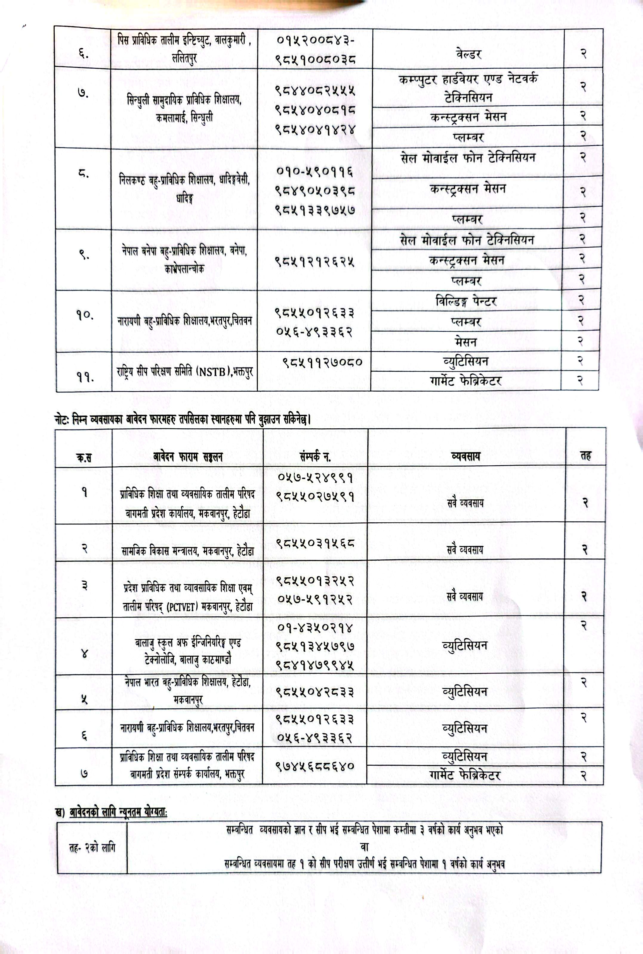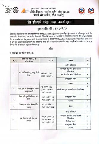 विभिन्न सीप भएका वा सीपमूलक तालिम लिएका तर हालसम्म CTEVT (Council for Trechnical Education and Vocational Training) प्राविधिक शिक्षा तथा व्यवसायिक तालिम परिषद बाट सीप परिक्षण नगरेका व्यक्तिहरुका लागि सीप परीक्षण कार्यक्रम सन्चालन गर्ने बारे सूचना