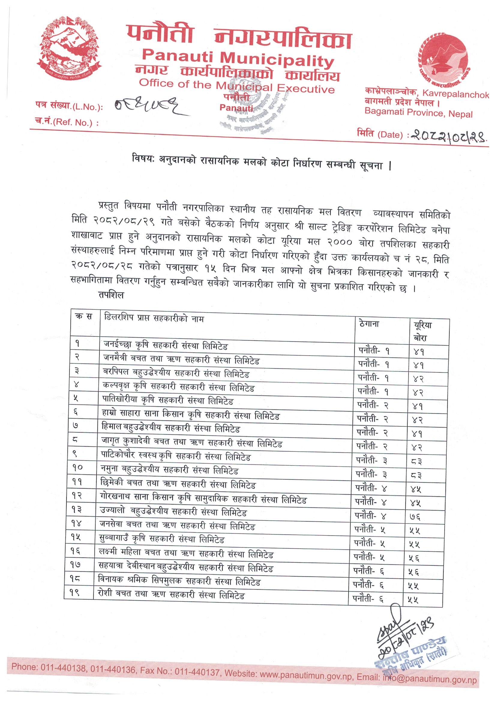 अनुदानको रासायनिक मलको कोटा निर्धारण सम्बन्धी सूचना ।