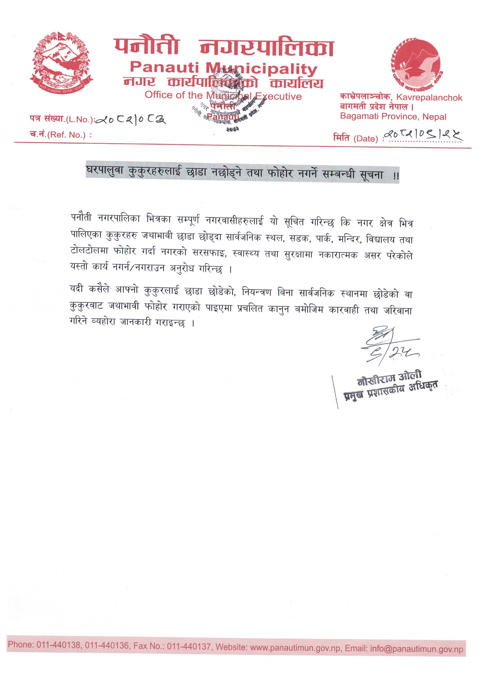 » घरपालुवा कुकुरहरुलाई छाडा नछोड्ने तथा फोहोर नगर्ने सम्बन्धी सूचना ।