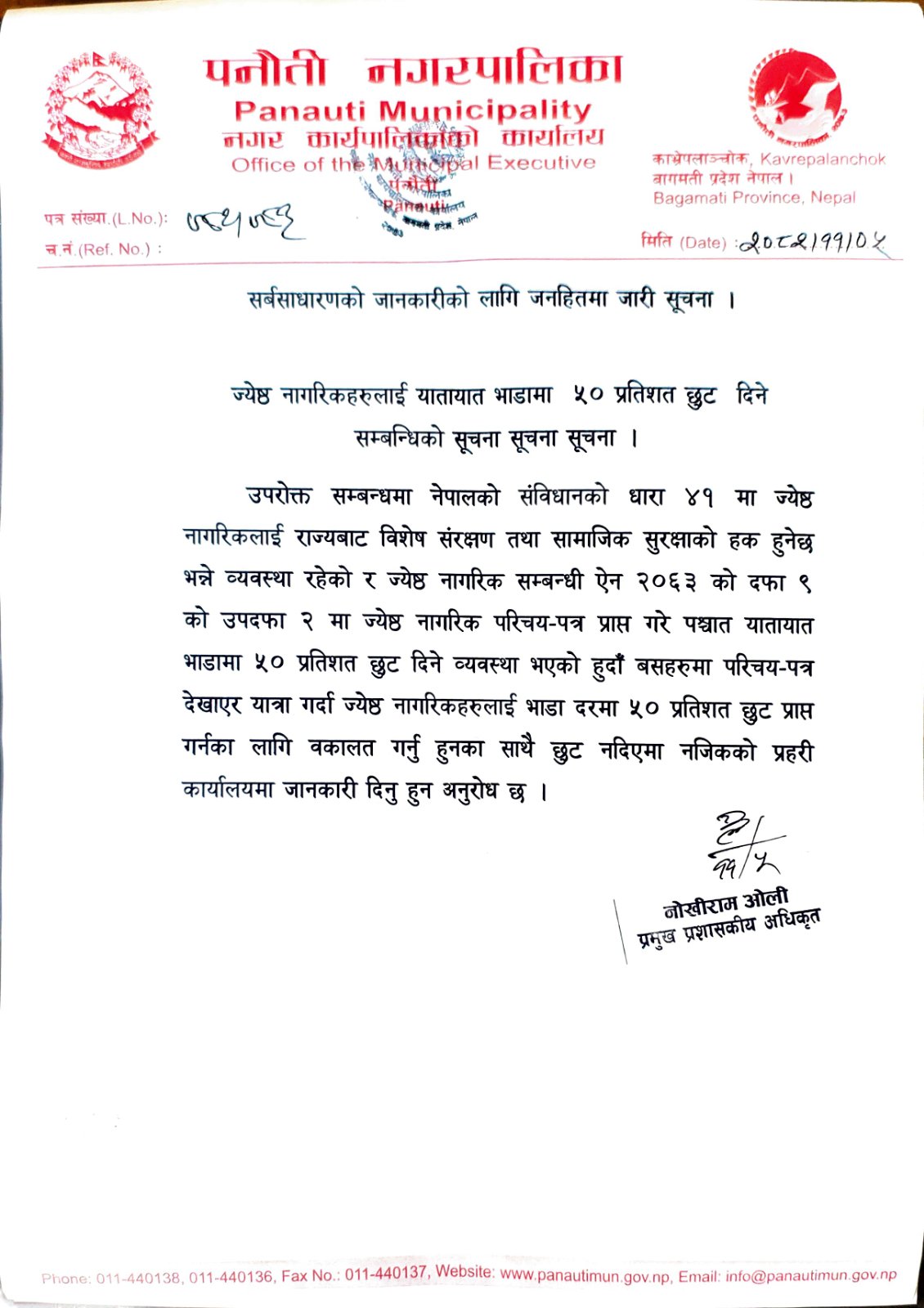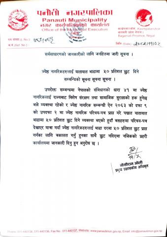 जेष्ठ नागरिकहरुलाई यातायात भाडामा छुट सम्बन्धि सूचना