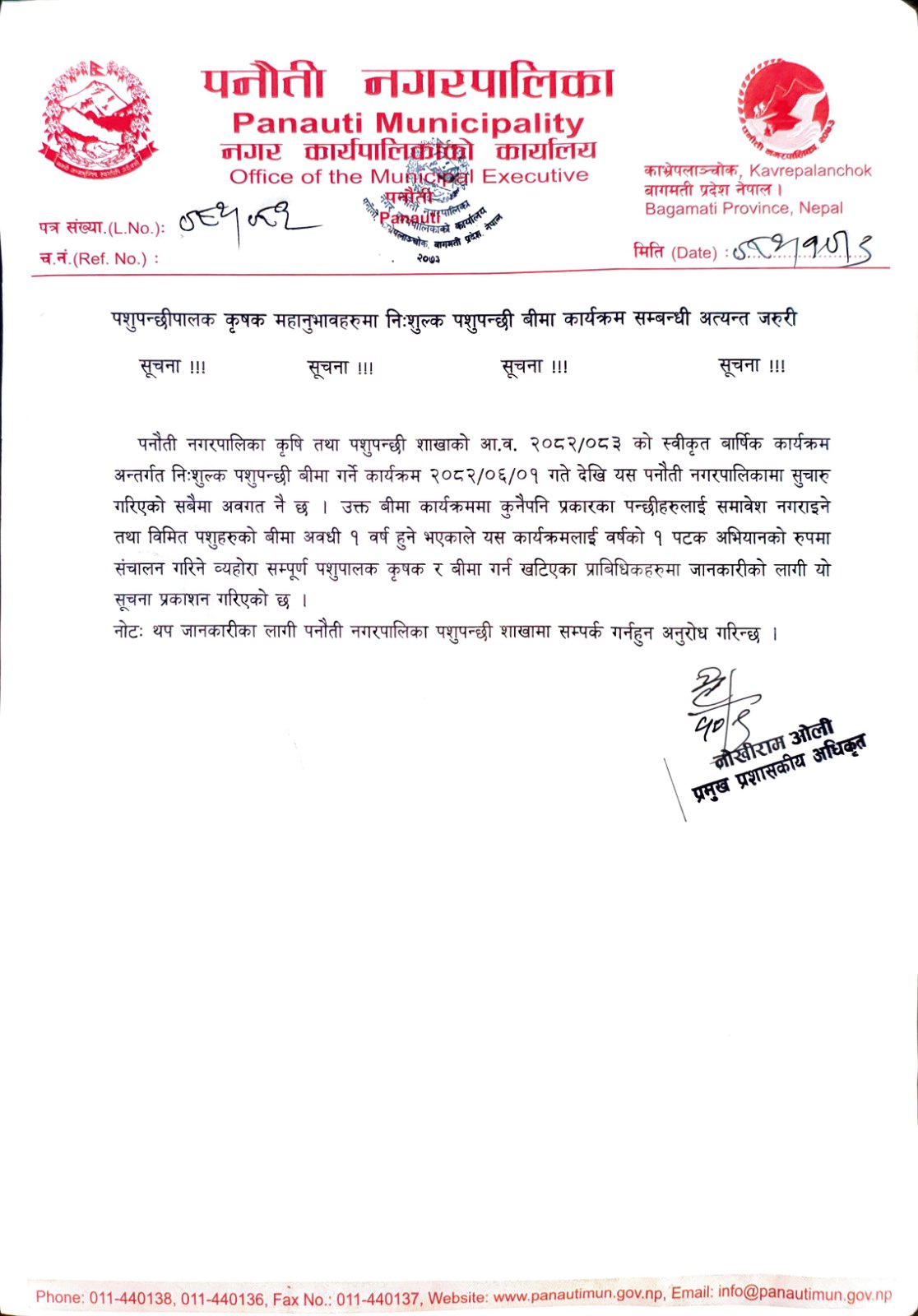 पशुपन्छीपालक कृषक महानुभावहरुमा नि:शुल्क पशुपन्छी बीमा कार्यक्रम सम्बन्धी अत्यन्त जरुरी सूचना ।