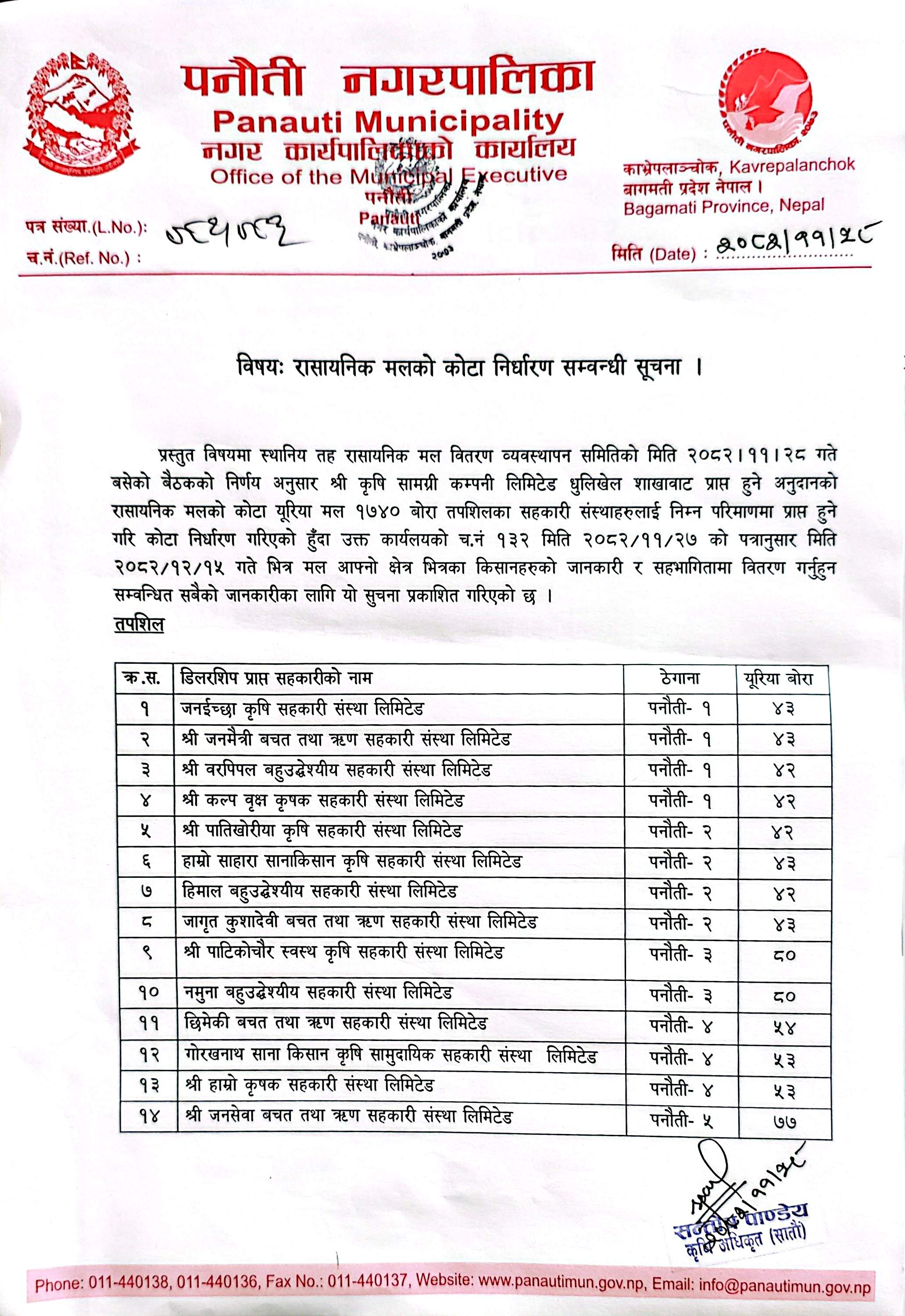 रासायनिक मलको कोटा निर्धारण सम्बन्धी सूचना