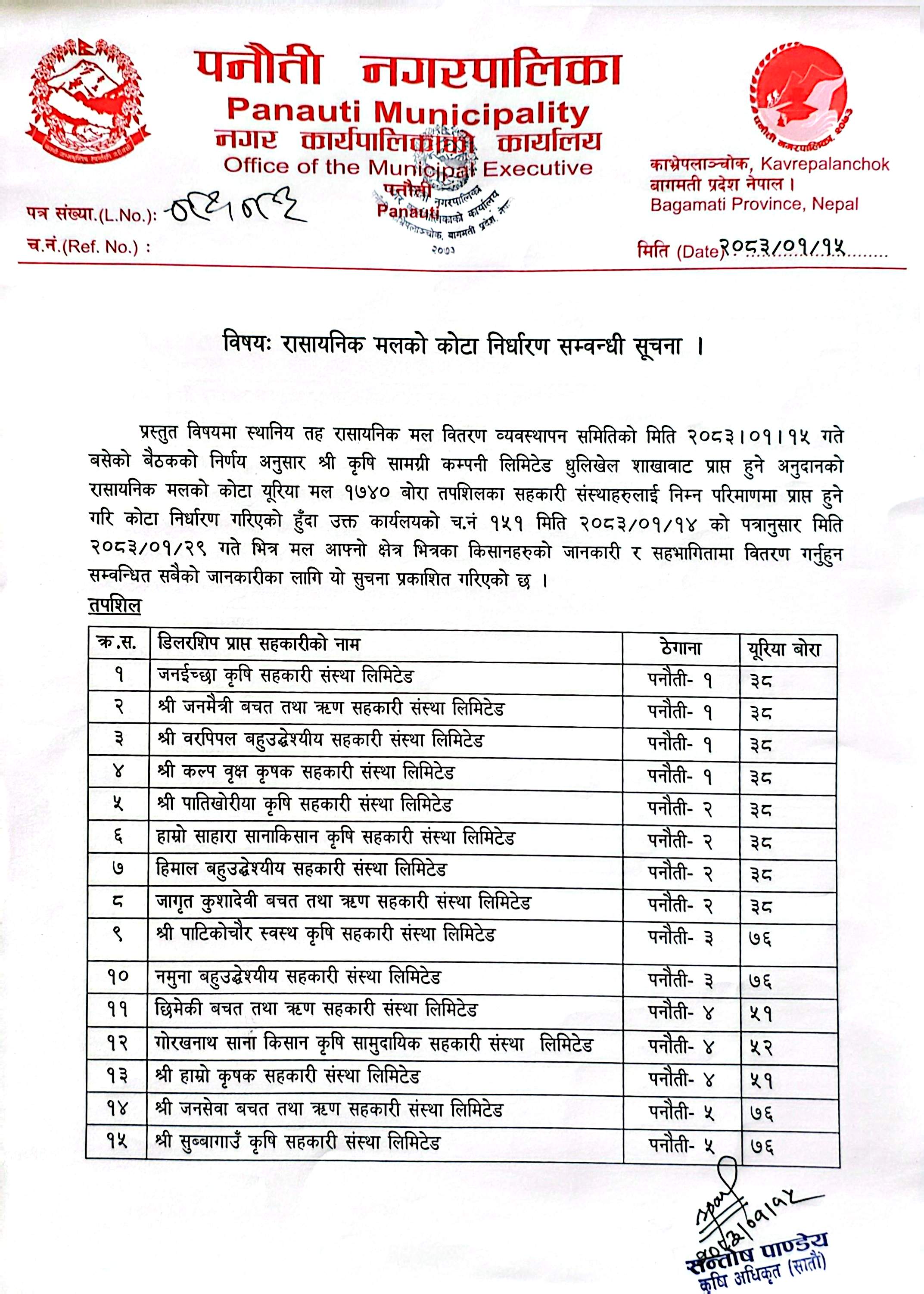 अनुदानको रासायनिक मलको कोटा निर्धारण सम्बन्धी सूचना।