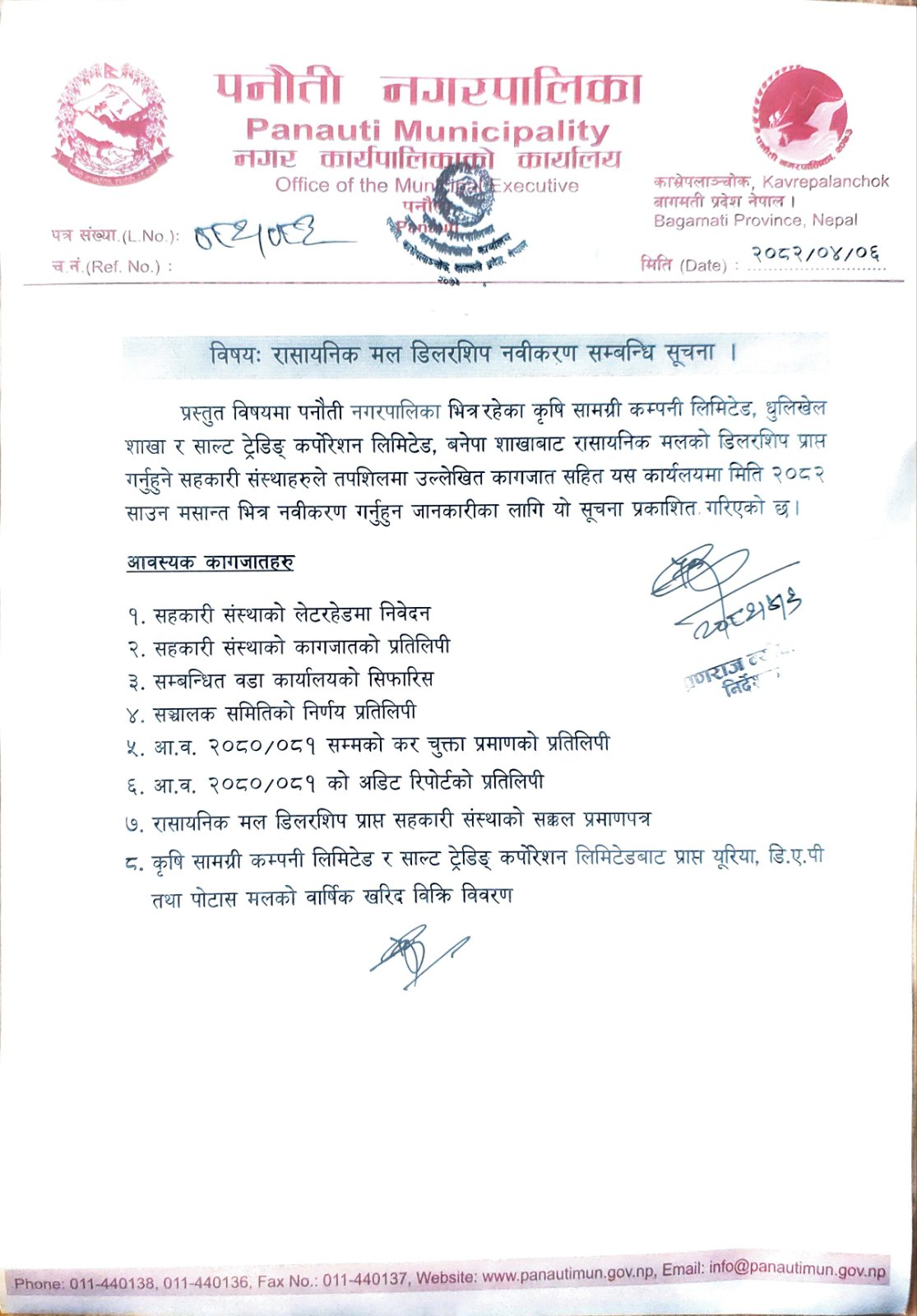 » रासायनिक मल डिलरशिप नवीकरण सम्बन्धि सूचना ।